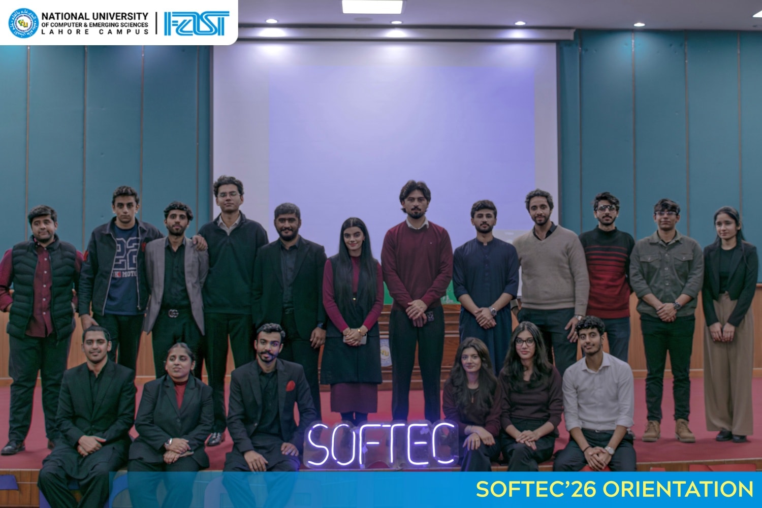 The SOFTEC’26 Orientation was held on December 1st, 2025 at the Syed Rafaqat Ali Auditorium, running from 11:30 AM to 3:00 PM and marking the exciting beginning of a new SOFTEC journey. The event featured our Chief Guest, Miss Ayesha Chaudhary, along with our esteemed Faculty Advisors Dr. Saira Karim, Mr. Mubashir Baig, and Mr. Usama Hassan Alvi, joined by Dr. Zeeshan Ali Rana, Head of the Software Engineering Department.The session opened with inspiring addresses by Dr. Saira Karim and our Chief Guest, who highlighted SOFTEC’s legacy of creativity, innovation, and teamwork. With 600+ attendees, the auditorium buzzed with energy as Eemaan Ahmad, President of SOFTEC’26, set the tone for the event through her welcome address.An engaging Q&A session with exciting giveaways kept the audience actively involved. The most anticipated moment arrived with the unveiling of the SOFTEC’26 logo, symbolizing the official kickoff of a thrilling new chapter—along with the reveal of the event dates.The introduction of the SOFTEC’26 core and executive teams, including a powerful reveal video, showcased the passionate individuals driving this year’s event. The orientation also gave newer batches a glimpse into the SOFTEC legacy, motivating them to become part of one of FAST-NUCES' most iconic flagship events.SOFTEC’26 begins now—bigger, bolder, and more inspiring than ever.