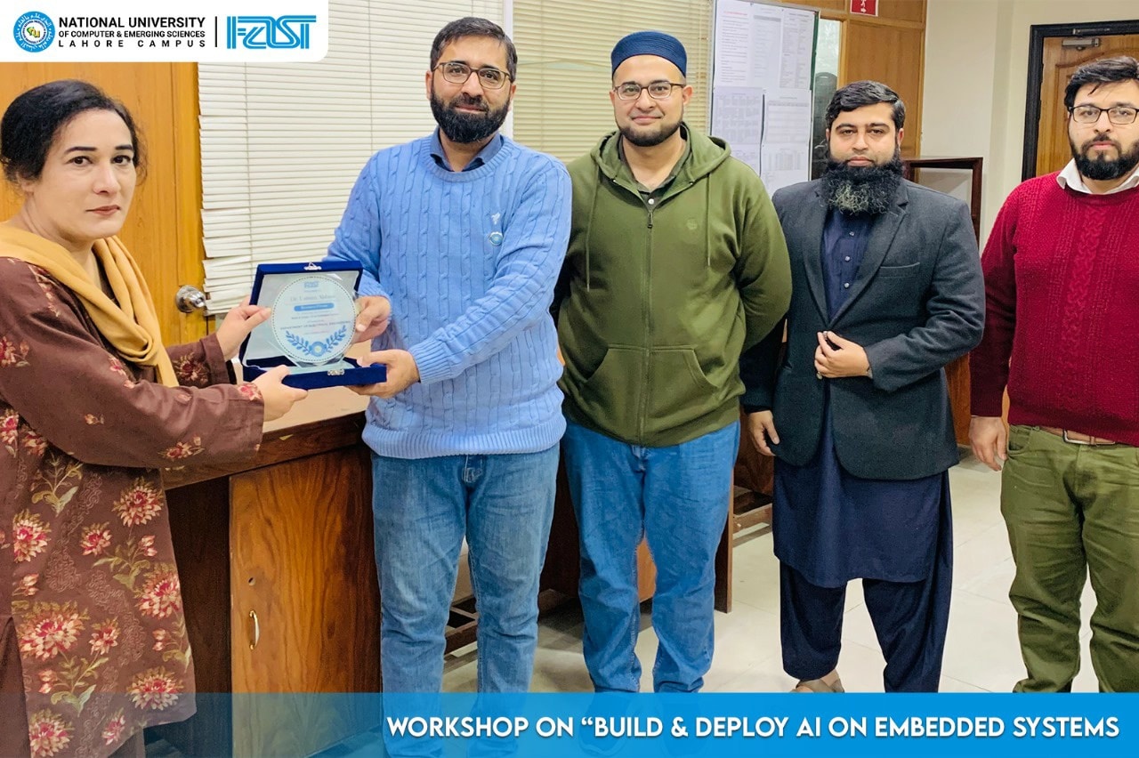 The Electrical Engineering Department, FAST-NUCES Lahore Campus, organized a hands-on workshop titled “Build & Deploy AI on Embedded Systems” on Thursday, November 27, 2025, in the Embedded Systems Lab. The session proved highly informative and engaging.Dr. Usman Abbasi, In-charge of the Electrical Engineering Department and Assistant Professor at FAST-NUCES Peshawar Campus, conducted the workshop. Embedded AI is an advanced and rapidly growing field with applications in healthcare, robotics, IoT, and smart systems. This workshop aimed to introduce students and faculty to the core concepts of Embedded AI while providing practical experience in implementing intelligent algorithms on hardware platforms. The goal was to equip participants with the skills and confidence needed to work on real-world AI-driven embedded systems.The resource person appreciated the active participation of students and shared positive feedback regarding their interest, responsiveness, and technical understanding. Certificates were awarded to participating students in recognition of their involvement, while a shield was presented to Dr. Usman Abbasi by the Head of the Electrical Engineering Department, Dr. Saima Zafar, in appreciation of his contribution.Overall, the workshop was a highly productive and enriching learning experience for all participants.