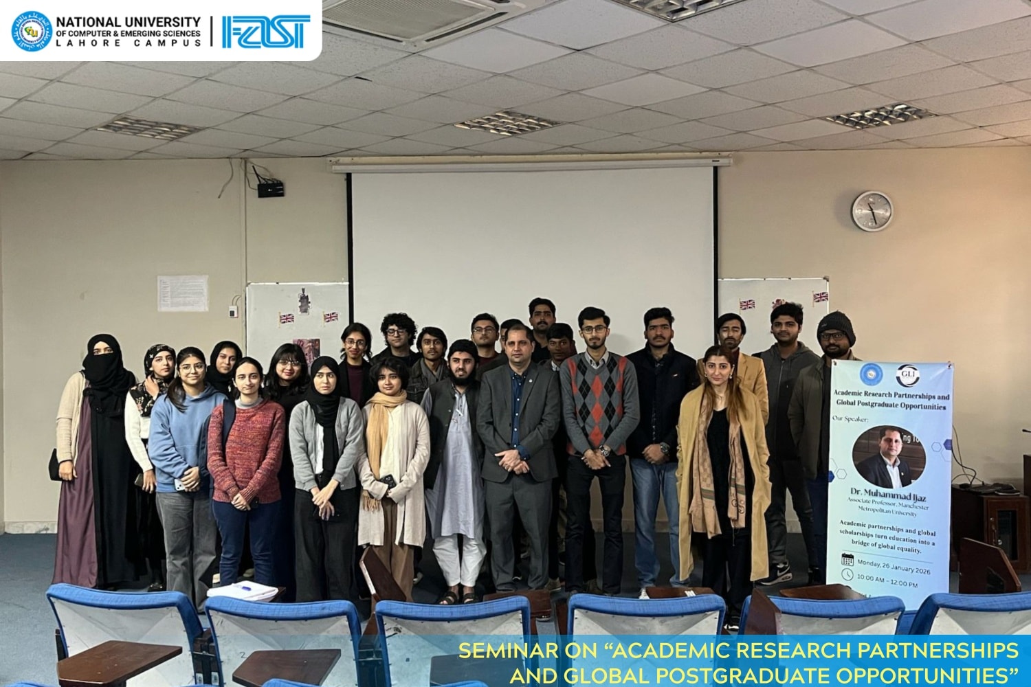 The Global Leaders Initiative (GLI), FAST-NUCES Lahore Campus, successfully conducted the seminar “Academic Research Partnerships and Global Postgraduate Opportunities”, led by Dr. Muhammad Ijaz, on Monday, 26 January 2026, from 10:00 AM to 12:00 PM at the Old Auditorium.The session was delivered by Dr. Muhammad Ijaz, Associate Professor and Department International Lead at Manchester Metropolitan University (MMU), UK. He highlighted international academic collaborations, joint research opportunities in emerging fields, and postgraduate pathways for FAST-NUCES graduates. The discussion also covered details of the £5,000 postgraduate scholarship, including eligibility criteria requiring a minimum academic standing of 70%.The seminar was attended by students and alumni from multiple disciplines, who actively engaged with the speaker throughout the session. The event successfully enhanced awareness of global academic opportunities and strengthened academic linkages between FAST-NUCES and MMU.