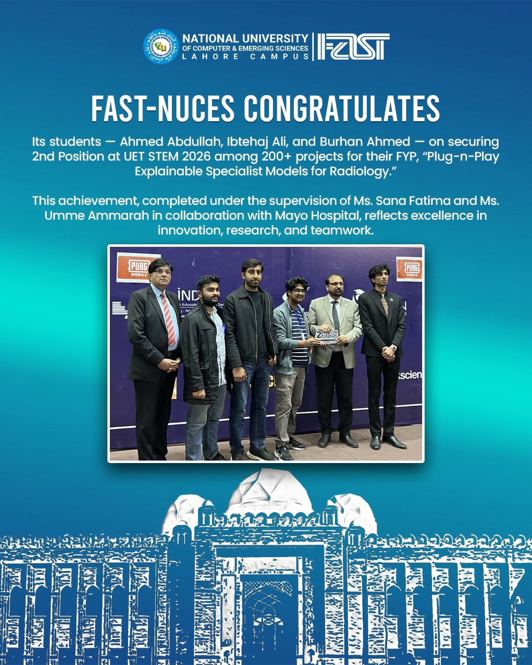 FAST-NUCES Lahore Campus proudly celebrates the remarkable achievement of its talented students Ahmed Abdullah, Ibtehaj Ali, and Burhan Ahmed, who secured 2nd Position among 200+ projects at UET STEM 2026 with their FYP “Plug-n-Play Explainable Specialist Models for Radiology.”